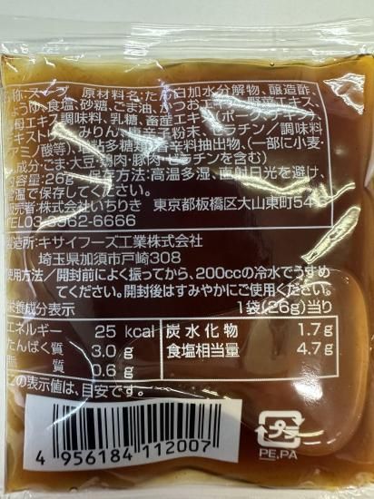 [商品名] 冷麺スープ [内容量] 28ml [原材料名] たん白加水分解物(国内製造)・醸造酢(小麦)・醤油(小麦・大豆)・食塩・ 鰹エキス・砂糖・ごま油・野菜エキス・酵母エキス(小麦・大豆)・乳糖(乳)・畜産エキス〔ポーク・チキン (豚肉・鶏肉点・ゼラチン)〕・みりん・香辛料・調味料(アミノ酸等)・増粘多糖類・香辛料抽出物 [原料原産地名]日本産 [内容量]26g [賞味期限] 製造より1年 [保存方法] 直射日光・高温多湿を避けてください。 [お召し上がり方]開封前に良く振って、200ccの冷水で薄める。 [販売元]株式会社いちりき [製造者]キサイフーズ工業株式会社